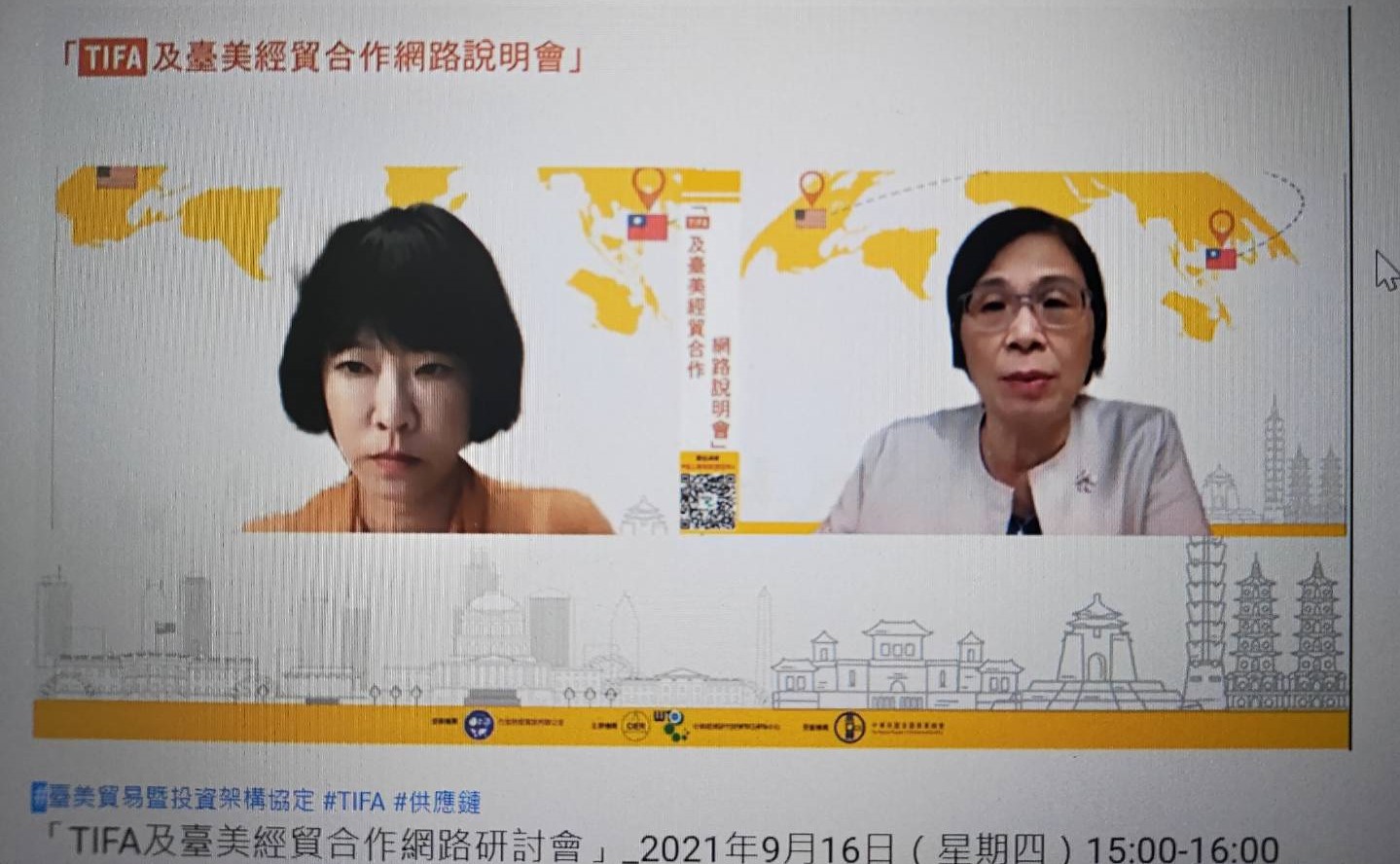 TIFA及台美經貿合作網路說明會由中華經濟研究院顏慧欣副執行長、楊珍妮副總談判代表及中華民國全國商業總會許舒博理事長開場